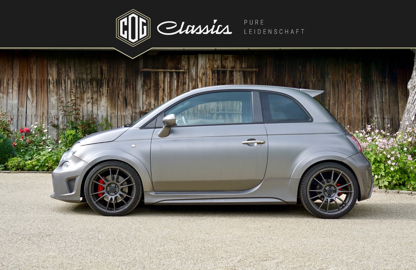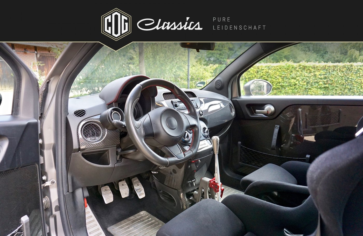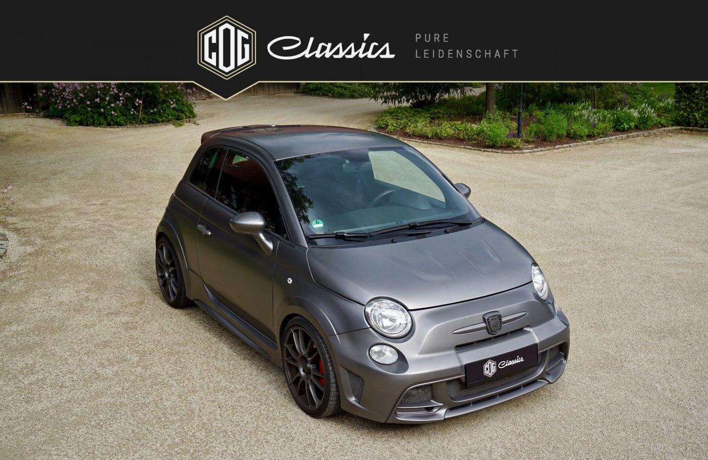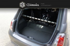 This special edition model “Abarth 695 Biposto” is the first Fiat 500 that can even stand up to big candidates by other manufacturers in regards to cubic capacity. It is without a doubt the smallest and most powerful sports car ever built. The approved-for-the-street vehicle with ex factory racing interior includes an upgrade turbo charger kit as well as a HJS 200 cells sport converter and runs on a custom-built Bilstein coilover suspension. These upgrades built in at Fiat increased the original purchase cost by 10,000 €. Additionally, our 695 Biposto exemplar remains the only one among all the specially produced units that features electric window regulators (no sliding windows) matte grey emblems, a matted grey hood and full carbon elements also painted matted grey ex factory. The original price was about 69,000 €