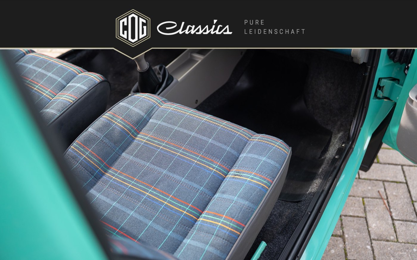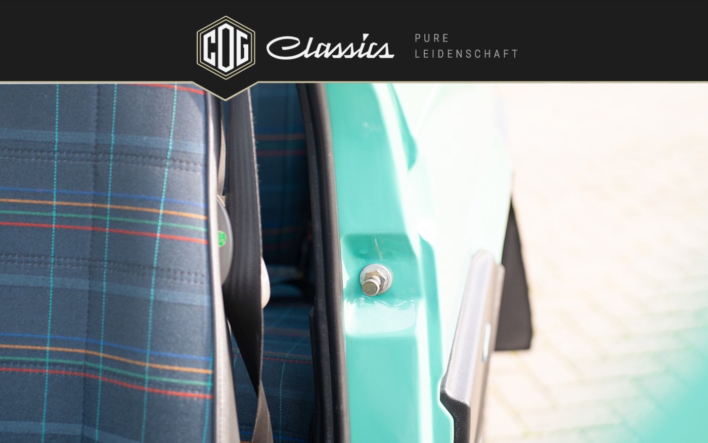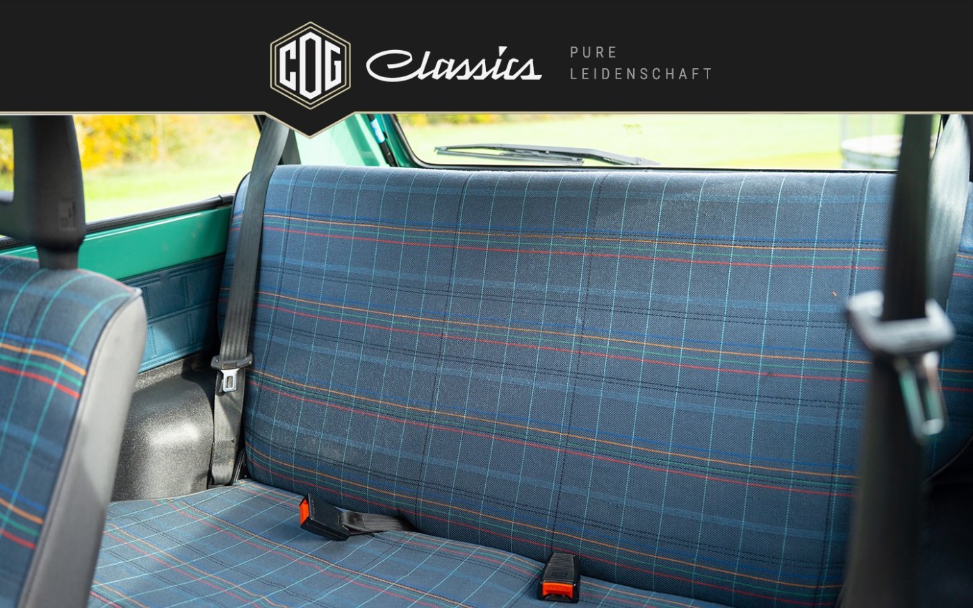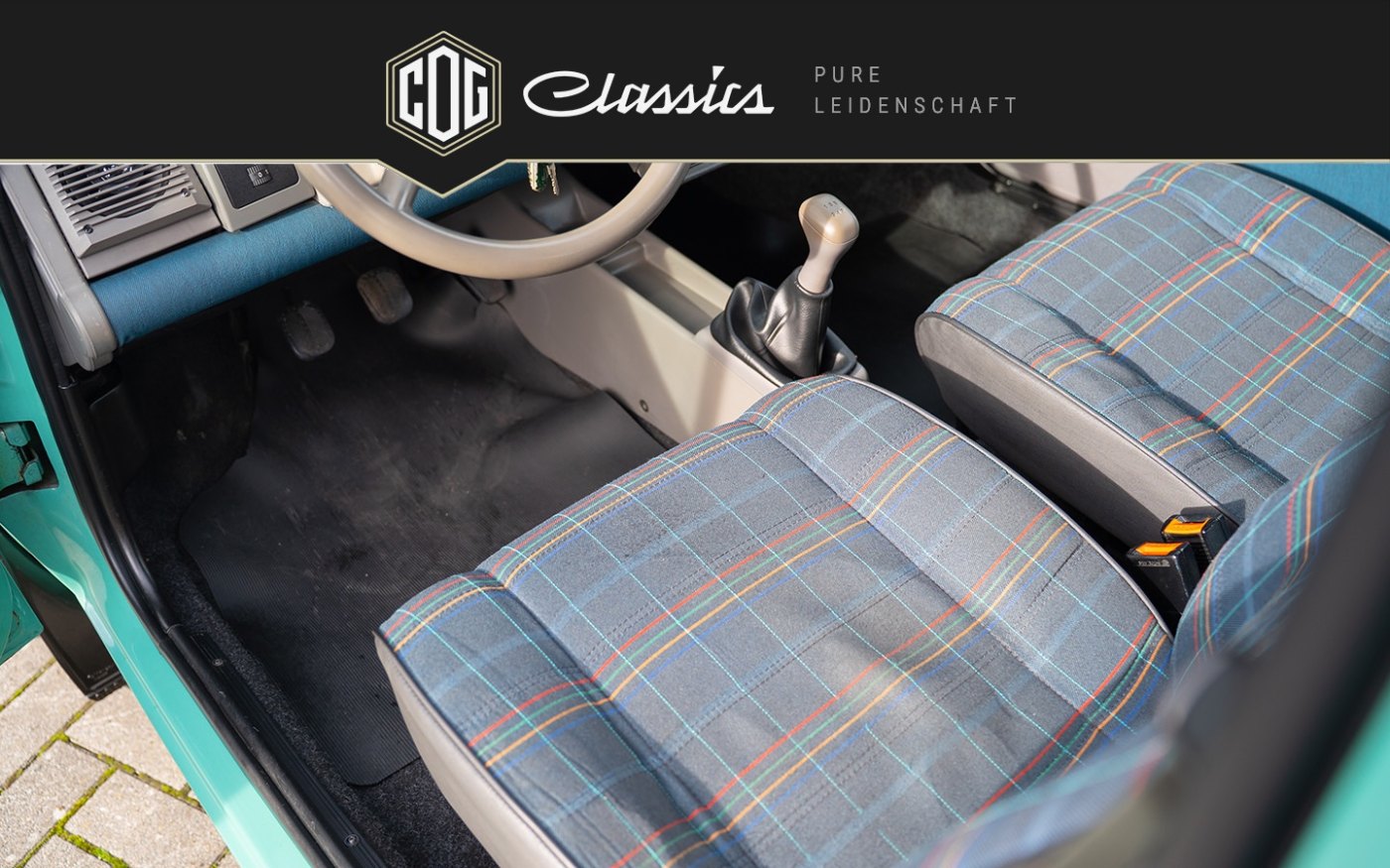 The bodywork is immaculate, free of rust spots and with a deep, glossy paint finish in meadow green. Inside, the vehicle impresses with its navy blue checkered fabric interior, which is in almost perfect original condition. Everything looks well-maintained, tidy, and fully functional: the front windows are electric, the rear windows are manually operated, and a car radio provides entertainment while driving. All instruments and displays are in perfect working order.
