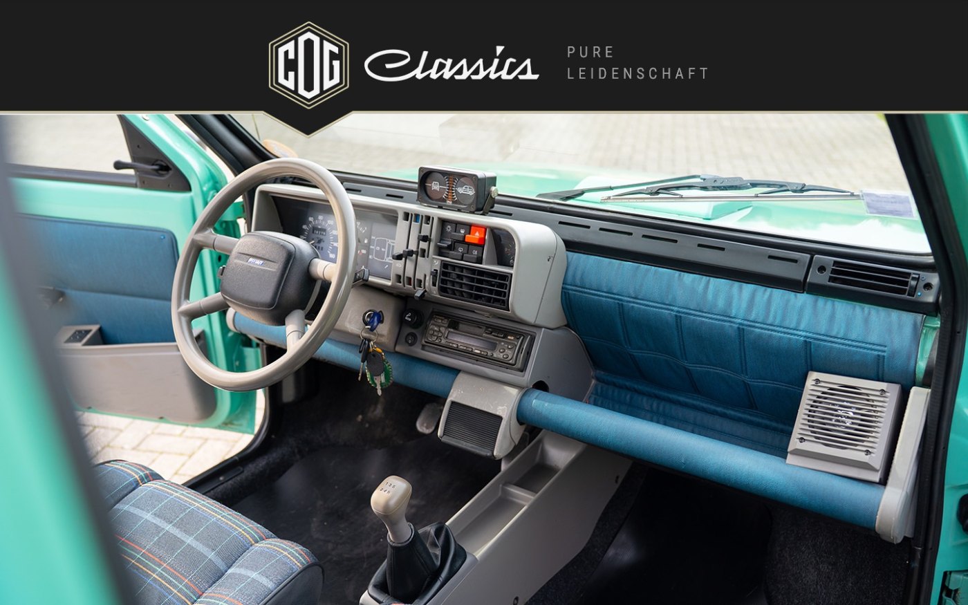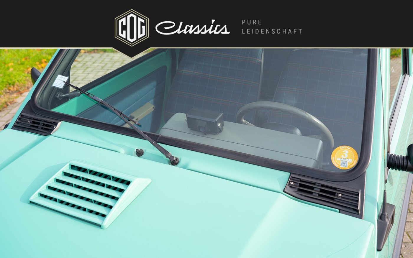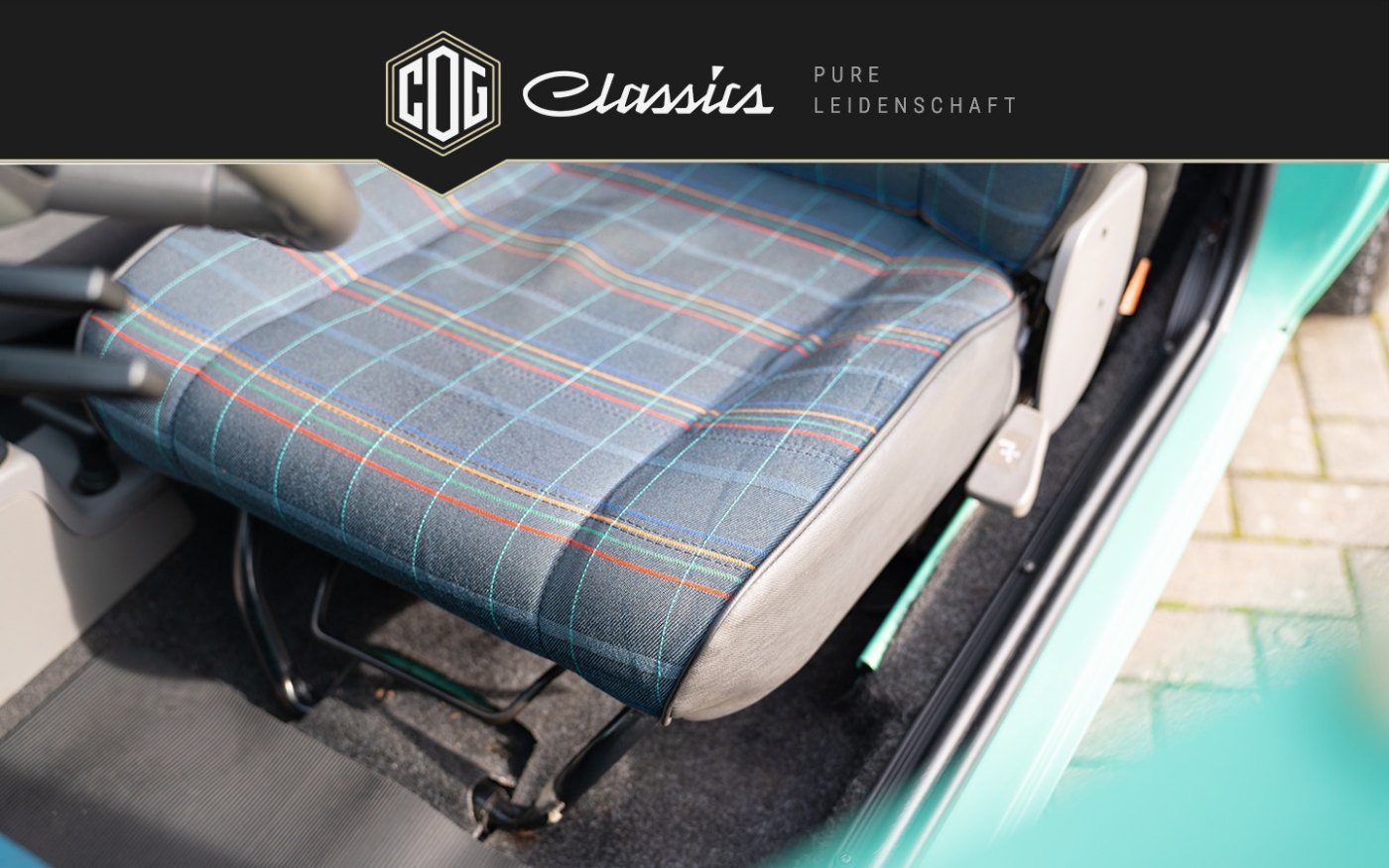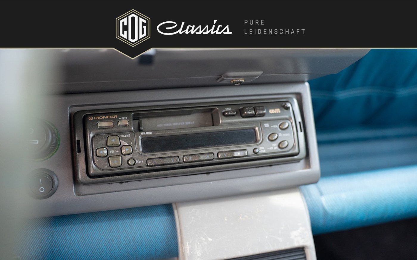 The bodywork is immaculate, free of rust spots and with a deep, glossy paint finish in meadow green. Inside, the vehicle impresses with its navy blue checkered fabric interior, which is in almost perfect original condition. Everything looks well-maintained, tidy, and fully functional: the front windows are electric, the rear windows are manually operated, and a car radio provides entertainment while driving. All instruments and displays are in perfect working order.