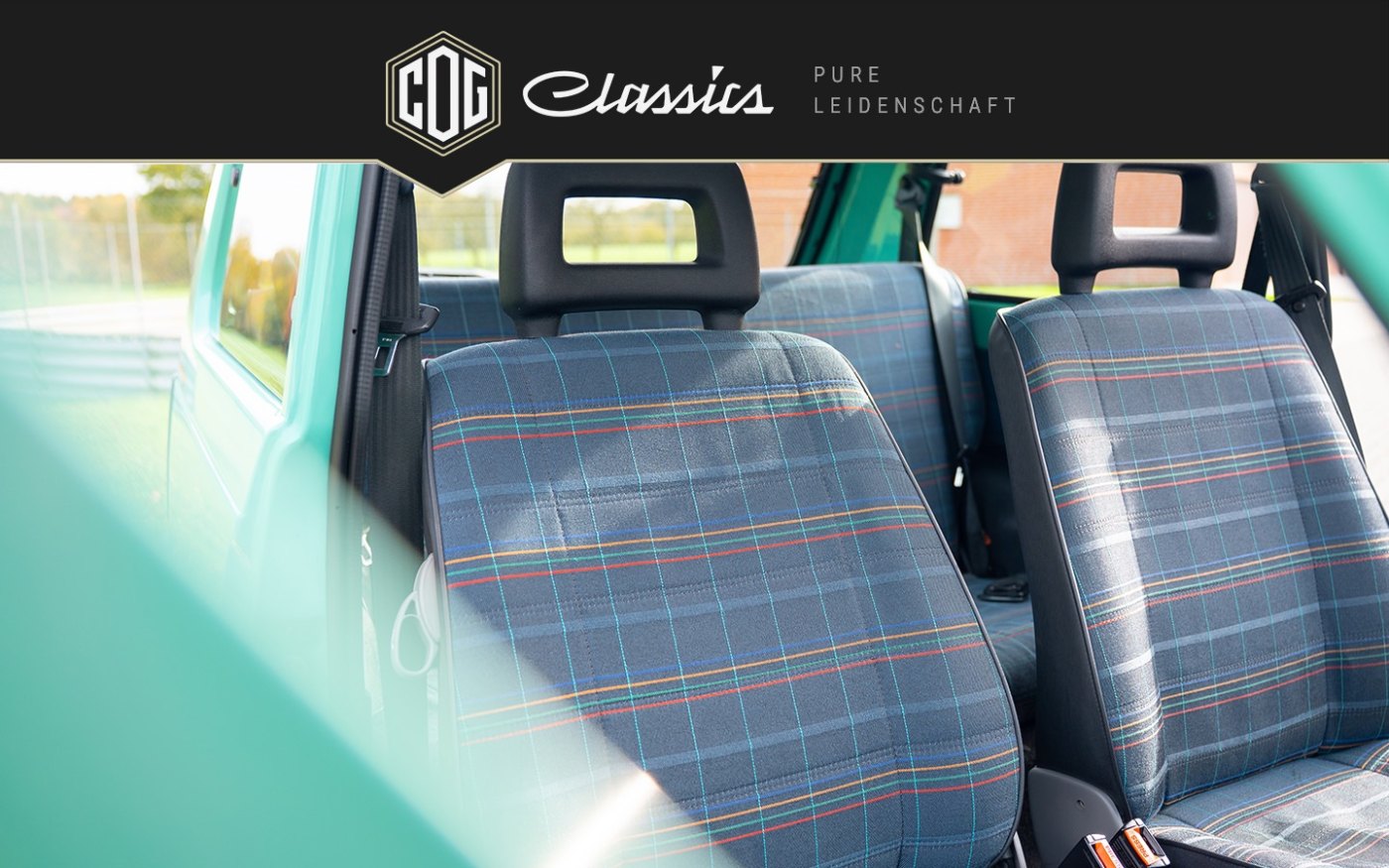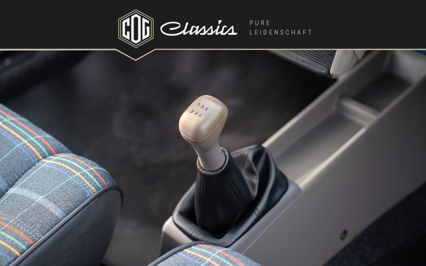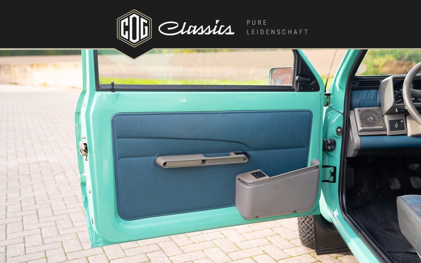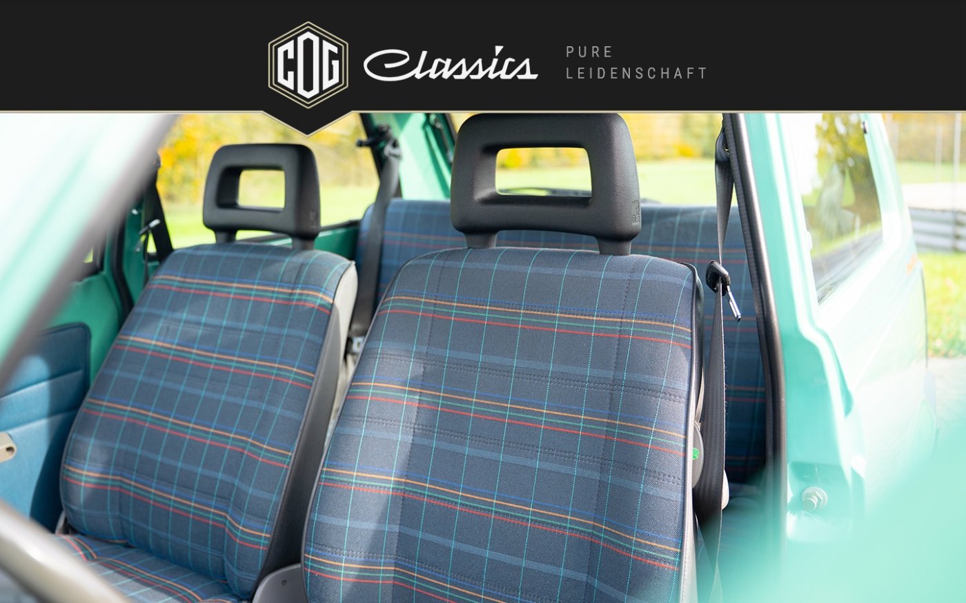 The bodywork is immaculate, free of rust spots and with a deep, glossy paint finish in meadow green. Inside, the vehicle impresses with its navy blue checkered fabric interior, which is in almost perfect original condition. Everything looks well-maintained, tidy, and fully functional: the front windows are electric, the rear windows are manually operated, and a car radio provides entertainment while driving. All instruments and displays are in perfect working order.