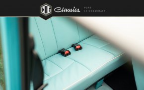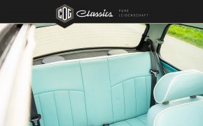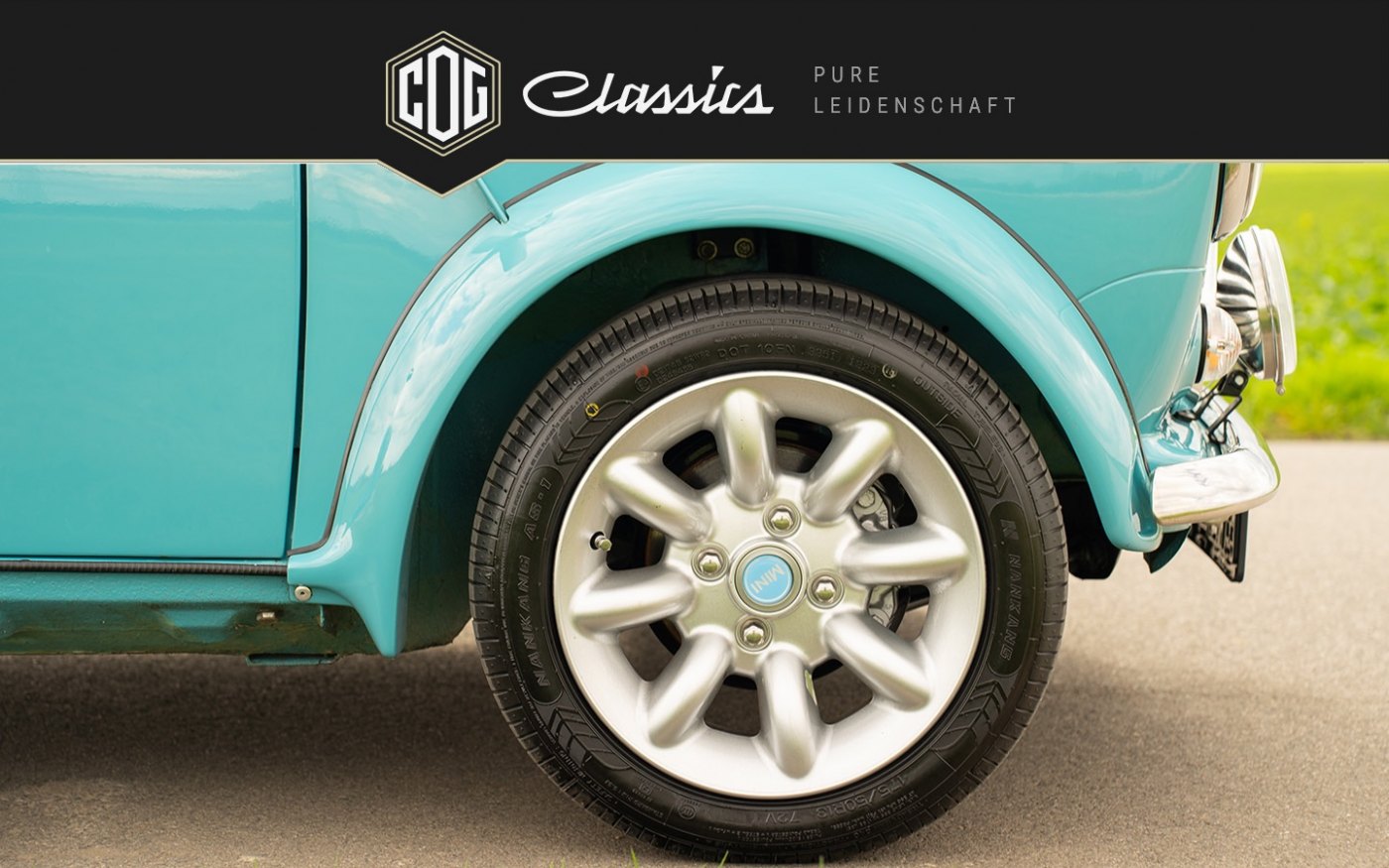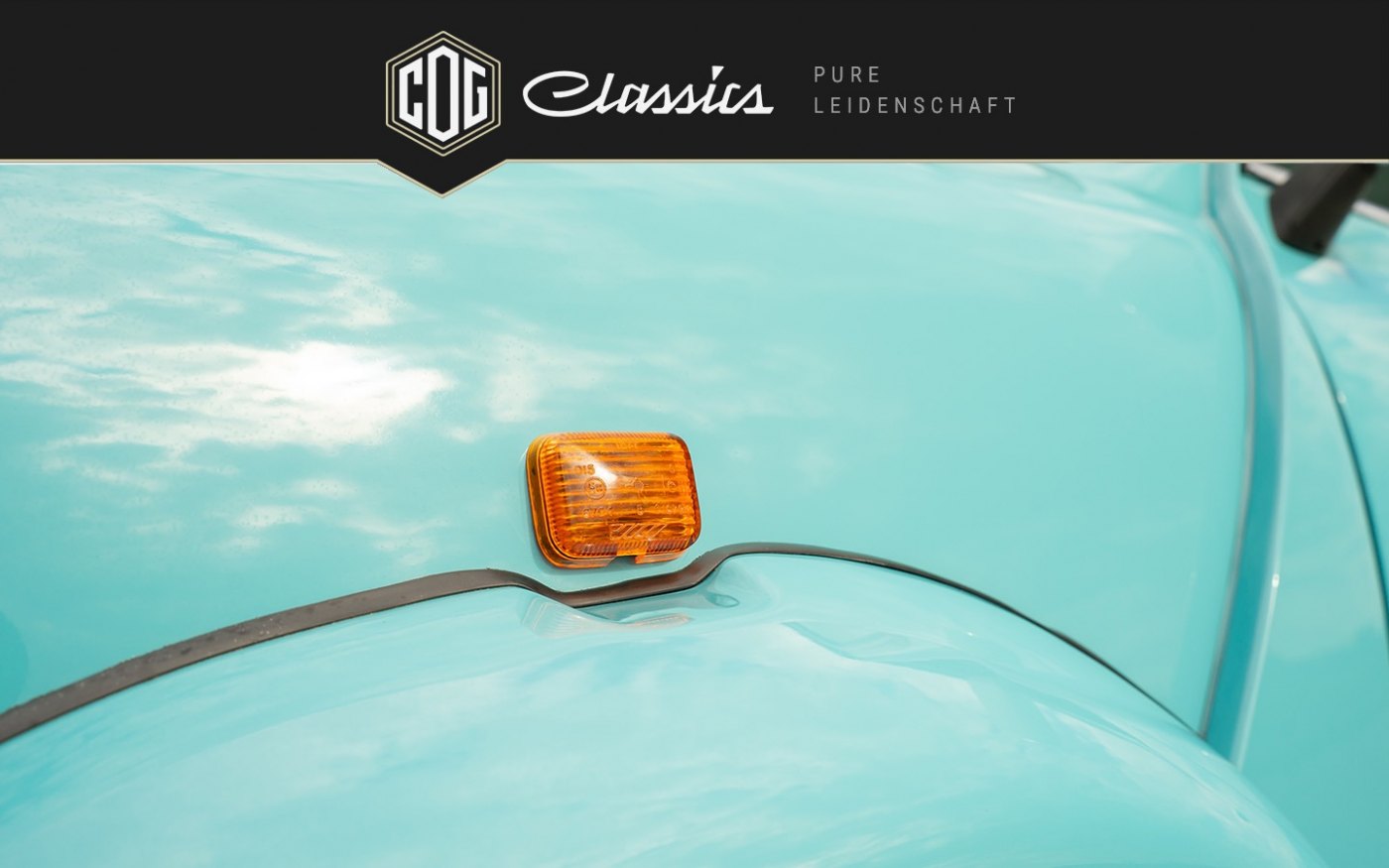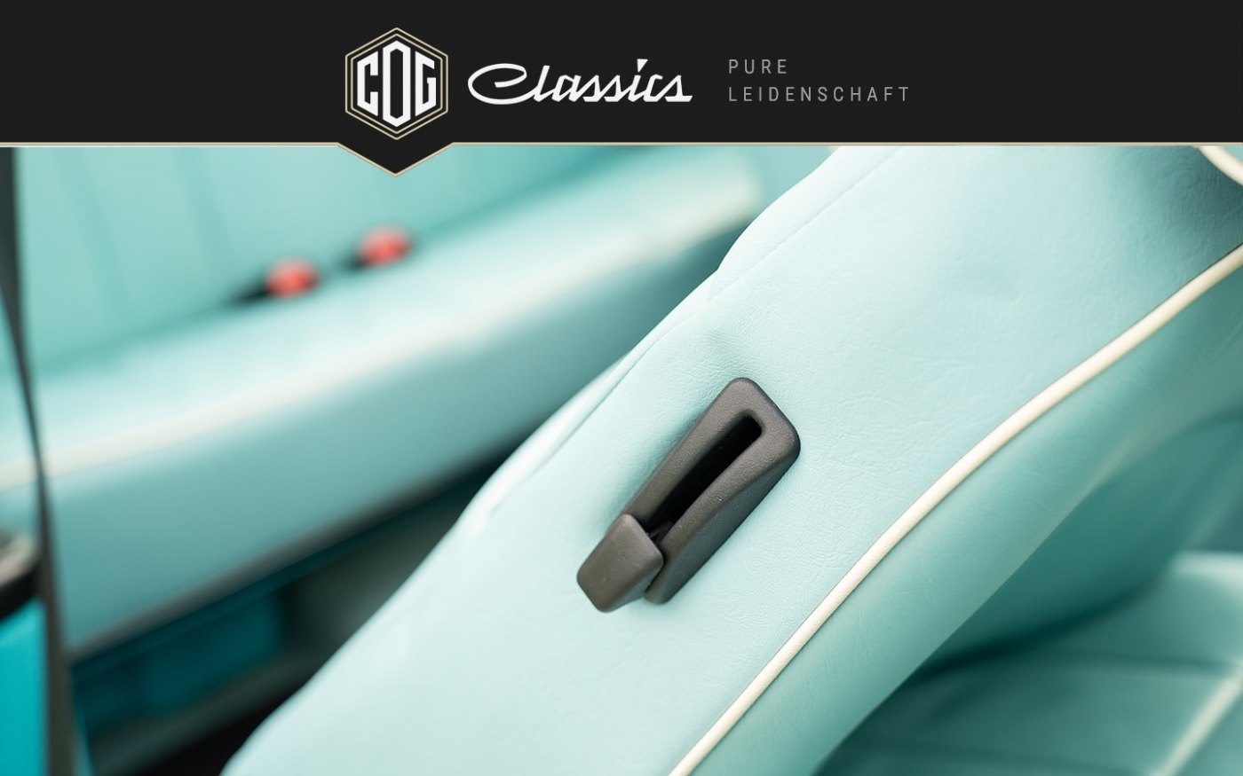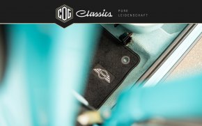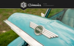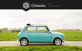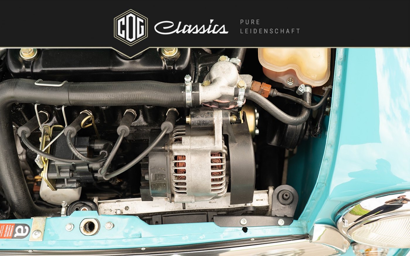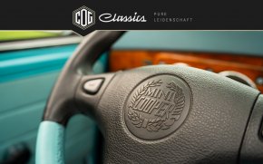 It's always summer with this color combination. You rarely see a Mini Cooper MPI in the color Surfblue. It is even rarer when the interior is exactly the same color. This tropical color combined with the electric sunroof transforms this Mini into a stylish summer vehicle. The old look with the latest technology from the "old" Minis. A displacement of just under 1.3 liters with a sporty 63 hp is more than enough to get around quickly. The Mini has been completely restored in terms of bodywork and technology. The interior, however, remained completely original. As the seat upholstery and carpets are no longer available in this fantastic color, it was decided to leave the interior untouched. The seats and carpets have therefore only been very thoroughly refurbished and, together with the exterior color, form a very refreshing sight in an automobile.