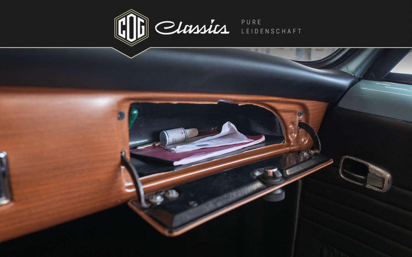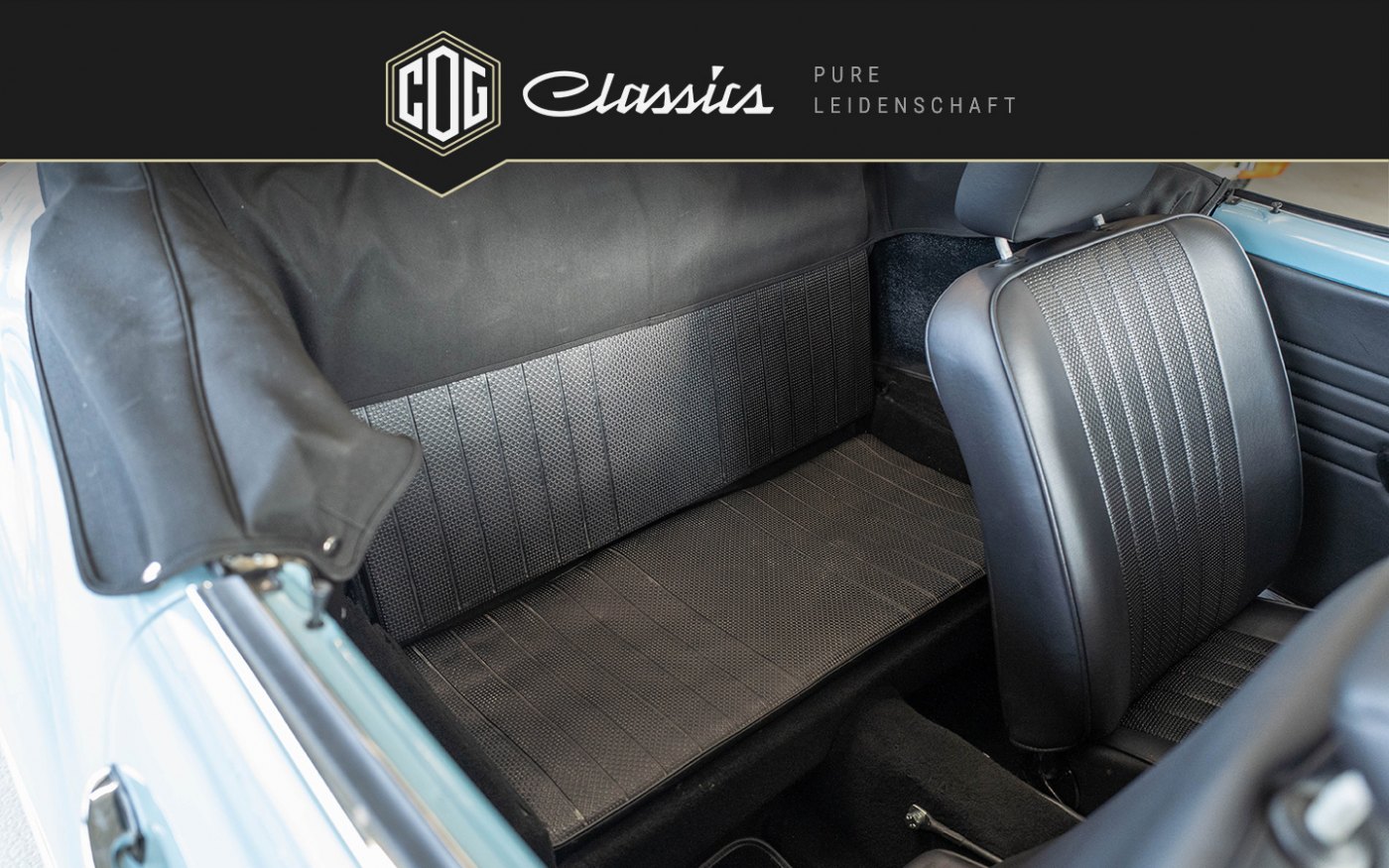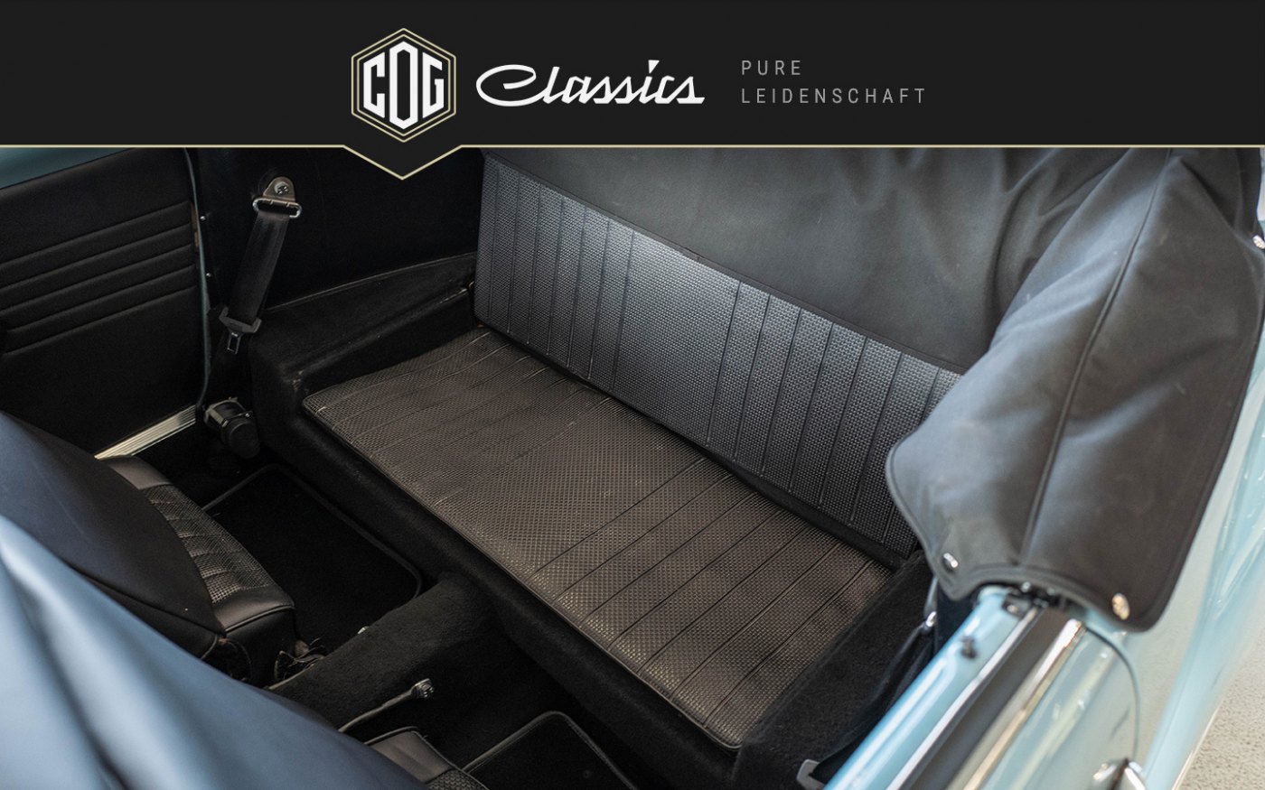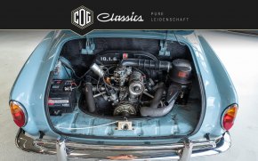 The rear seats are still original, the front seats have been reupholstered. The car was finally repainted in the original color chrome blue. A certificate for this vehicle from the Automuseum Wolfsburg is available.