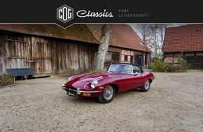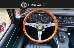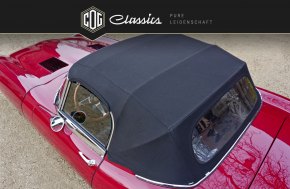 Dieses vollrestaurierte E-Type Cabrio wurde im Mai 1969 produziert. Es schaut nicht nur wunderschön aus, es fährt sich auch fantastisch. Der jetzige und erst zweite eingetragene Halter hatte dieses Fahrzeug im Jahre 2012 nach der Restauration auf sich zugelassen und konnte den Roadster aus gesundheitlichen Gründen nur knappe 1.300km einfahren. Zwischen 2008-2010 wurde das Cabrio vollständig restauriert und der Motor sowie das Getriebe revidiert. Der Reihensechszylinder zündet auf Knopfdruck und dreht unglaublich freudig daher. Die Restaurations-Arbeiten wurden fotodokumentarisch festgehalten und die Lichtbilder füllen einen kompletten Ordner. Die Fahrzeugpapiere belegen nur zwei eingetragene Halter und das E-Type Cabrio ist noch auf den jetzigen Halter zugelassen. Zum Jaguar gehören neben den vielen Rechnungen der FIVA-Wagenpass, die Jaguar Production Record im Original und ein auf Maß geschneidertes Fahrzeug-Pyjama.