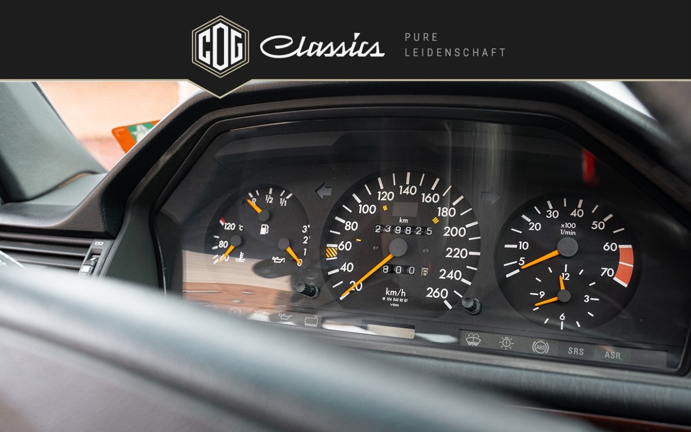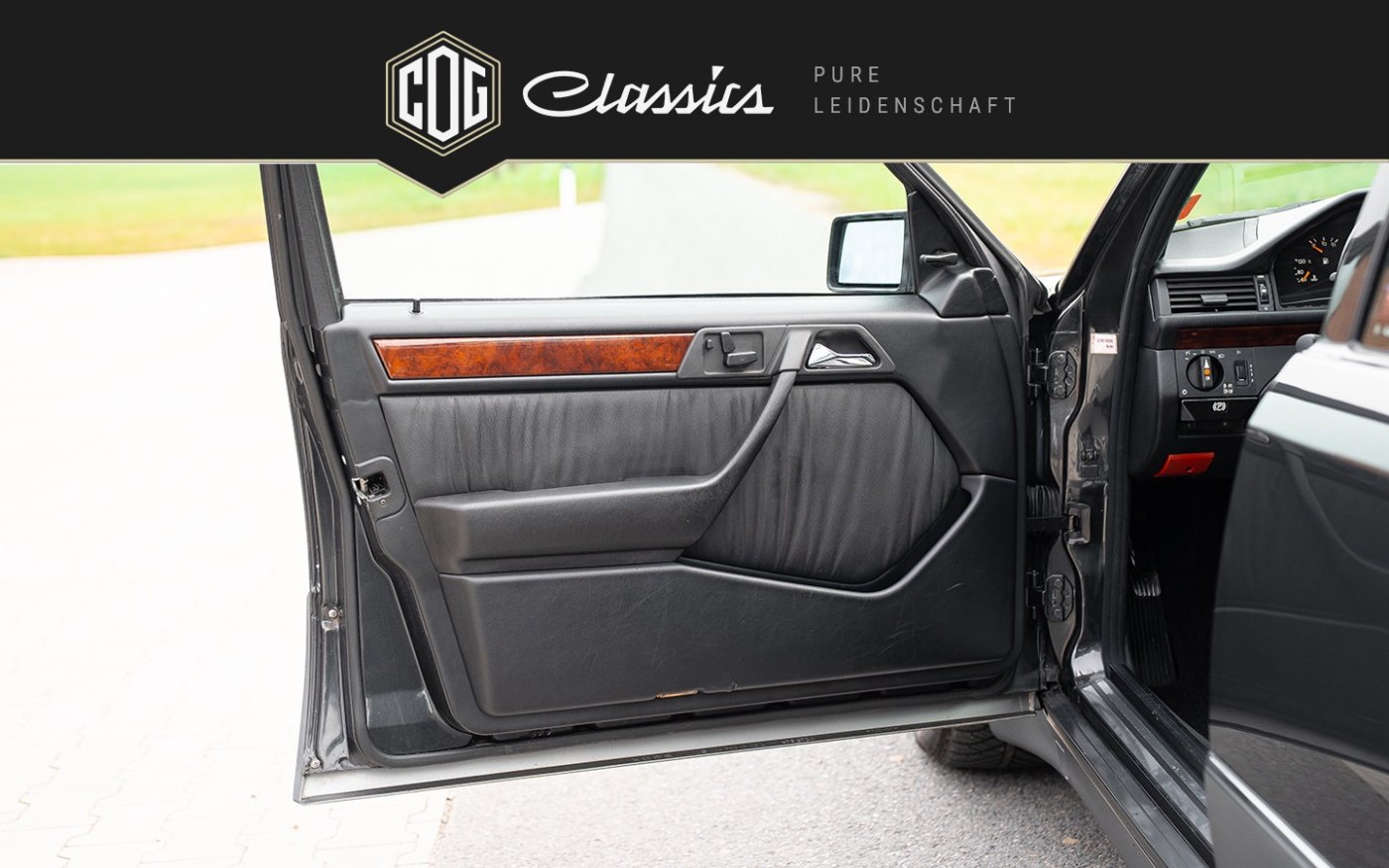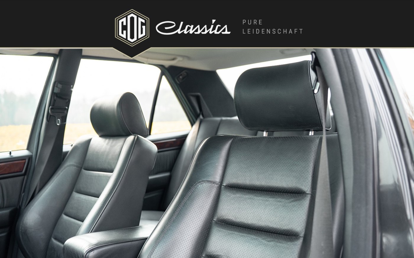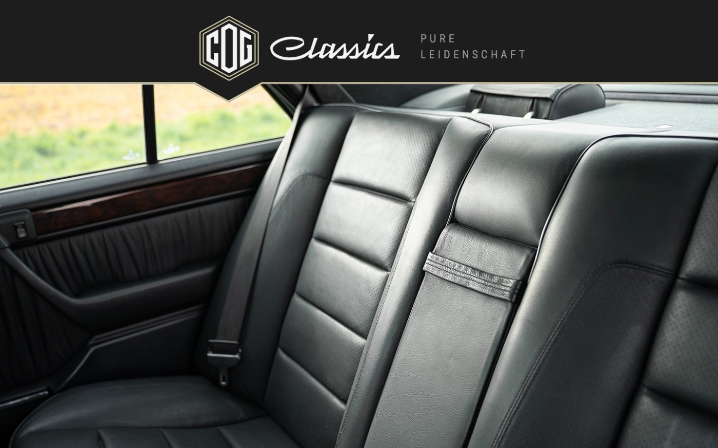 Der Wagen befindet sich überwiegend im Erstlack. Lediglich die hintere Beifahrertür sowie das angrenzende hintere Seitenteil wurden aufgrund von Kratzern einmal fachgerecht nachlackiert. Insgesamt präsentiert sich der 500 E in einem sehr authentischen, unverfälschten Zustand – genau so, wie ihn Sammler suchen.